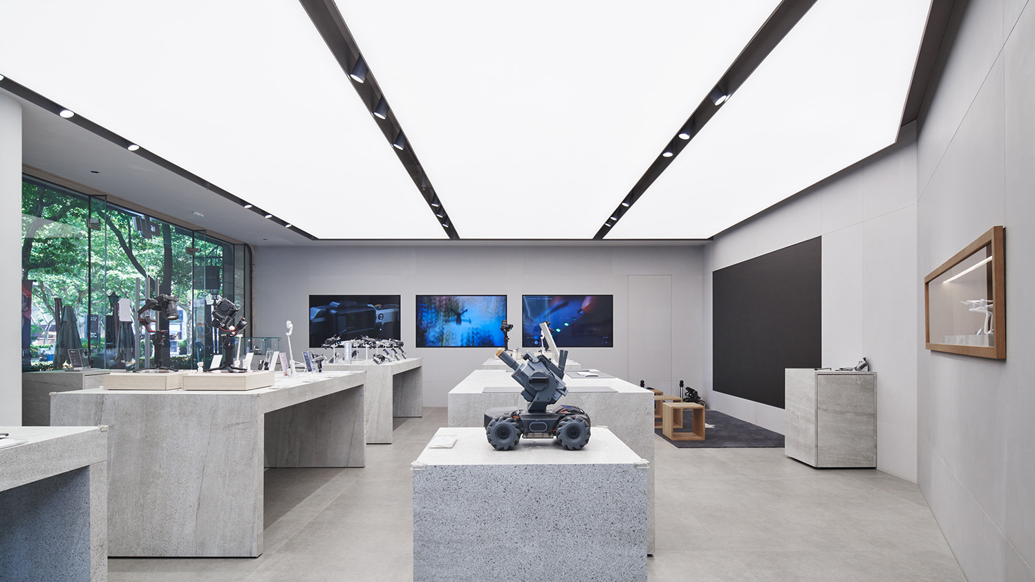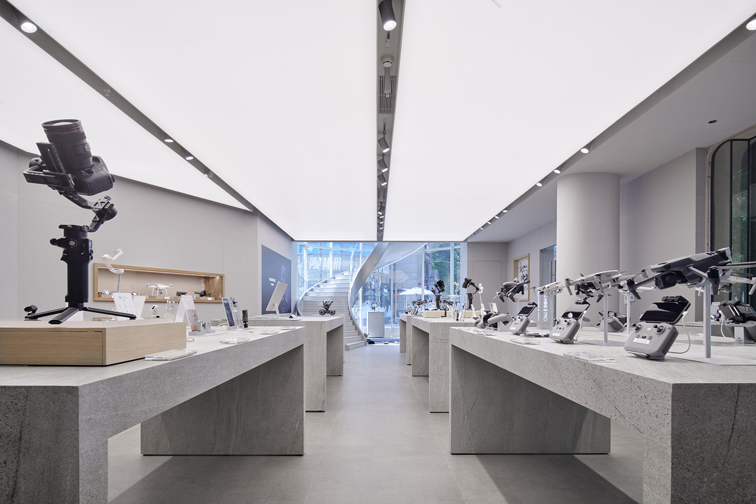 大疆線下門店裝修。 強(qiáng)調(diào)未來科技與永恒經(jīng)典相融合,打造一個(gè)有品質(zhì)感的博物館展陳空間,室內(nèi)由灰色石材構(gòu)成純粹的容器,精致的產(chǎn)品整齊均勻的陳列在“巨石”上,所有的展示陳列道具均由石材制作,形成規(guī)律穩(wěn)定的石塊矩陣,均質(zhì)的空間使產(chǎn)品更加突顯。