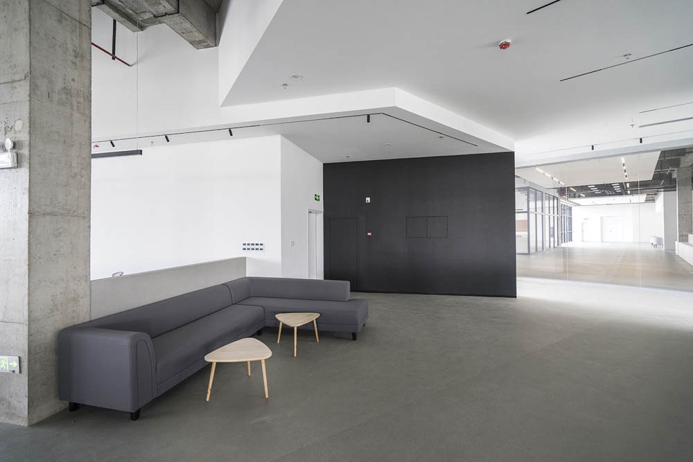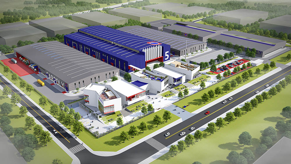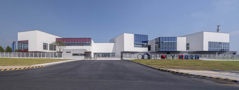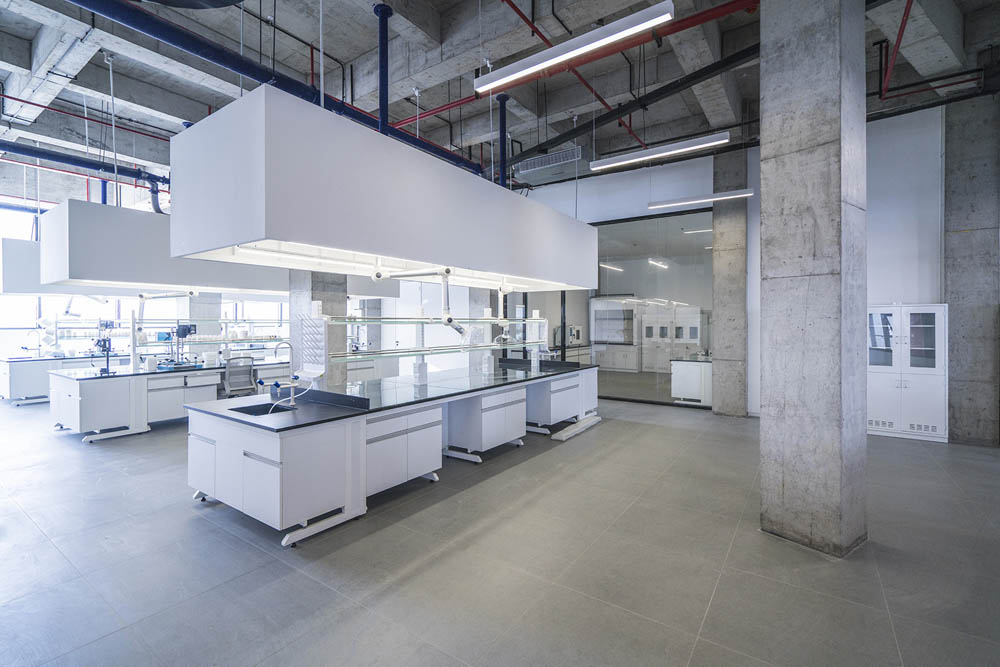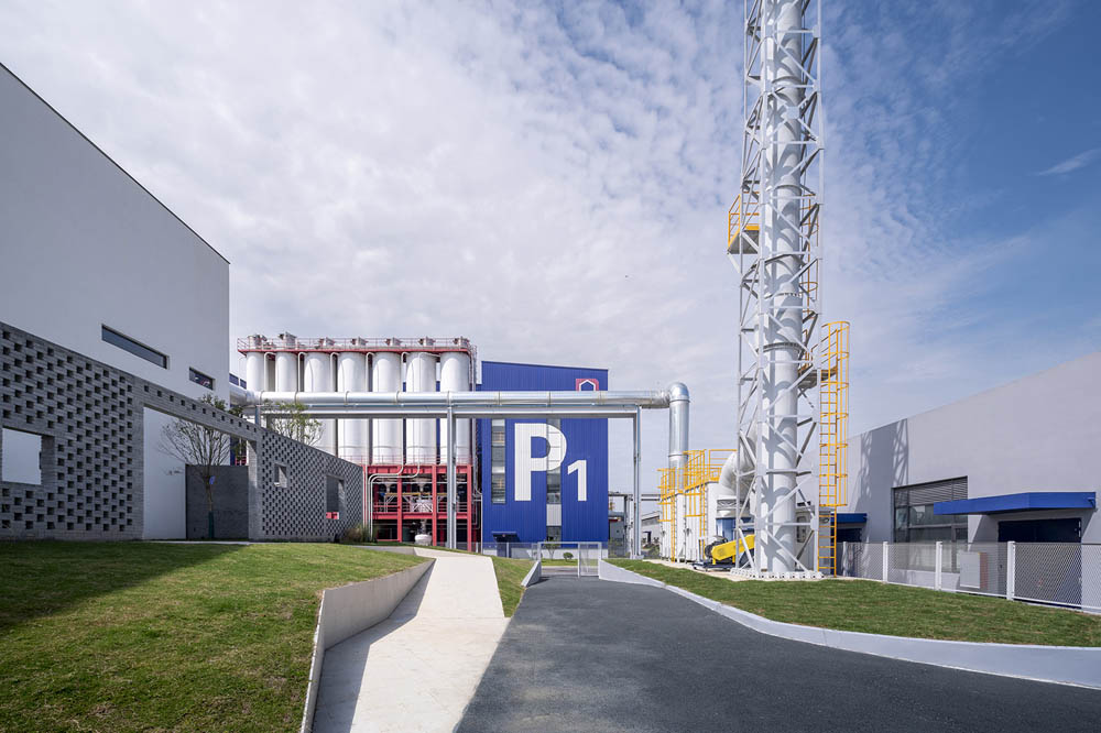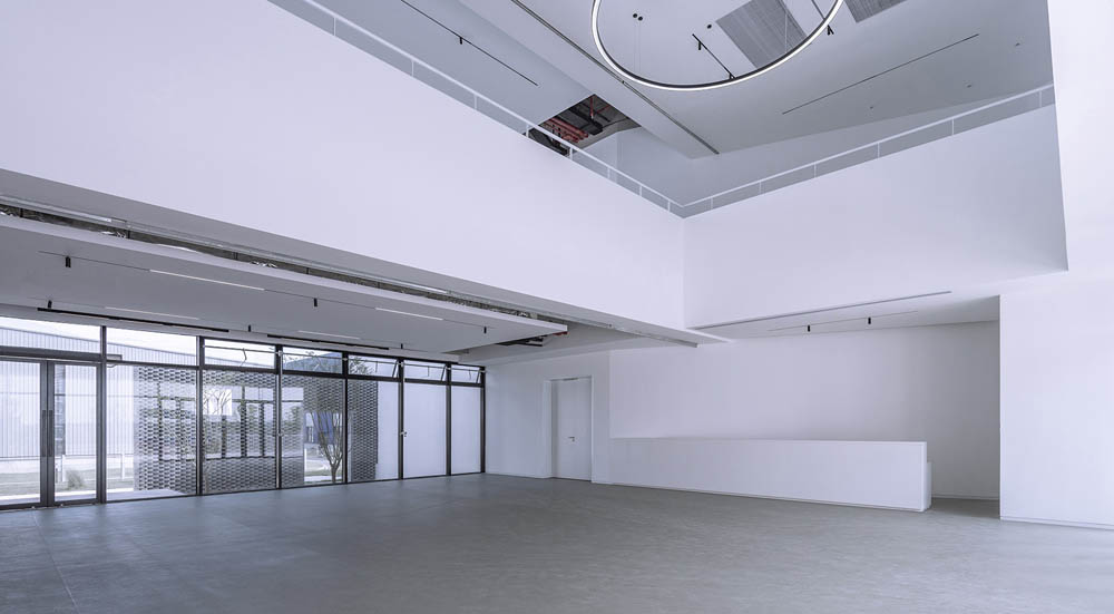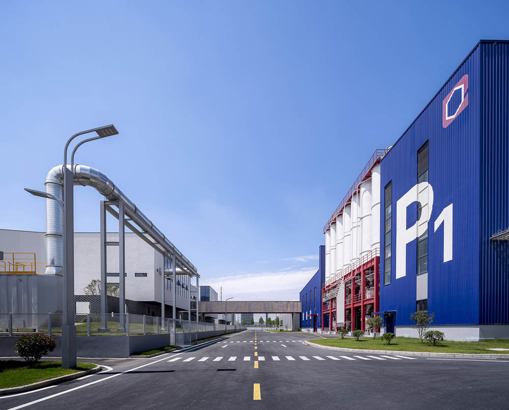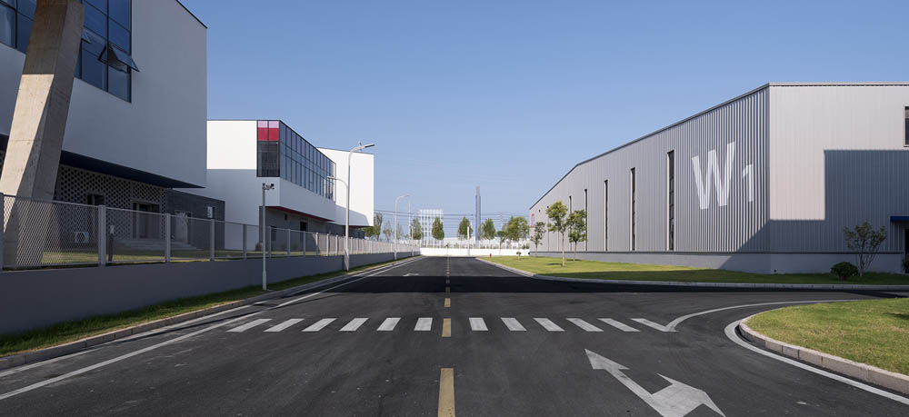 整個廠區(qū)的規(guī)劃的底層邏輯遵循著生產(chǎn)的秩序,建筑分為前端研發(fā)中心和后端廠房車間兩個部分——前端研發(fā)中心以實驗室、辦公為主,輔助以展廳、食堂、公共休息空間等;后端由兩個庫房和一個生產(chǎn)廠房三個體量組成。
