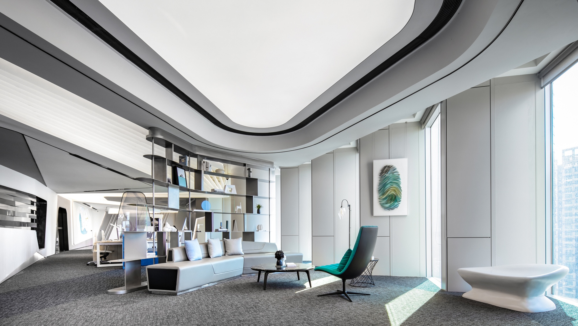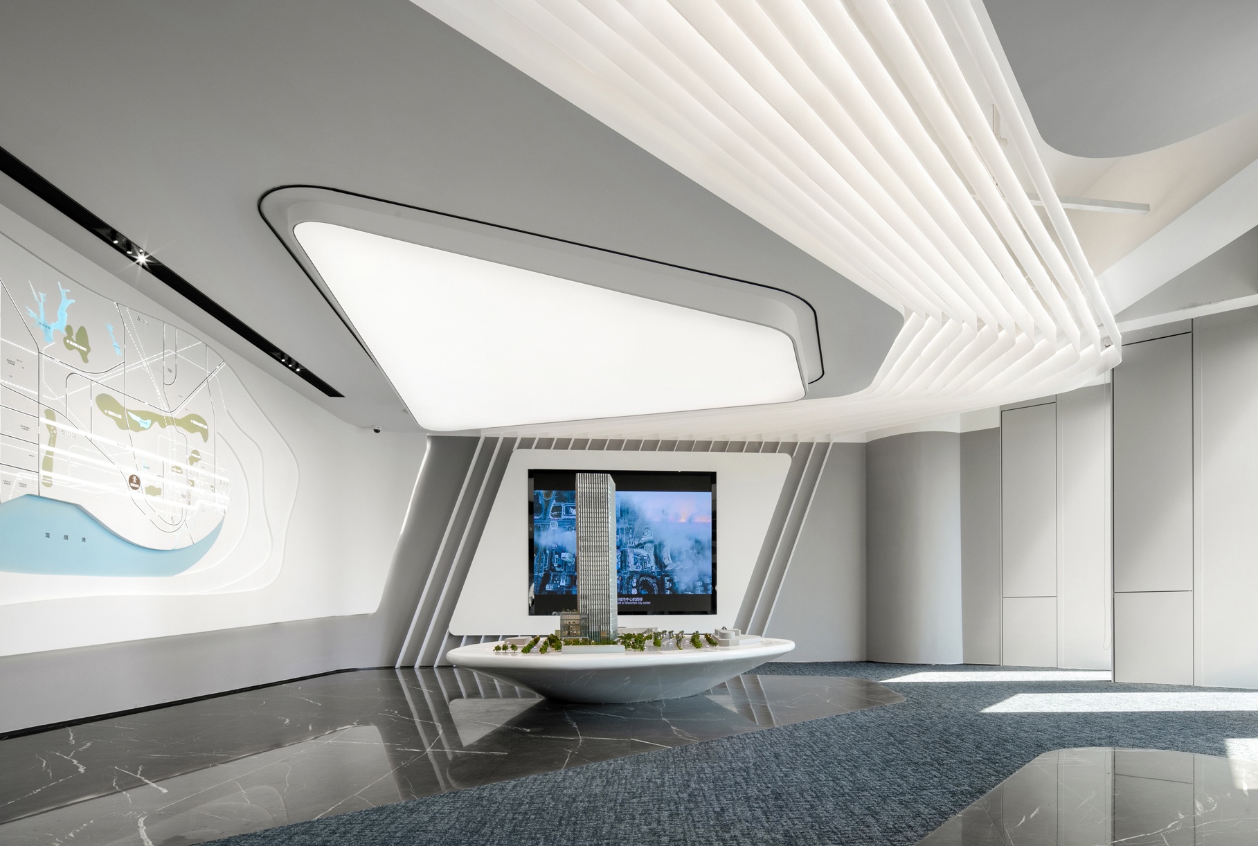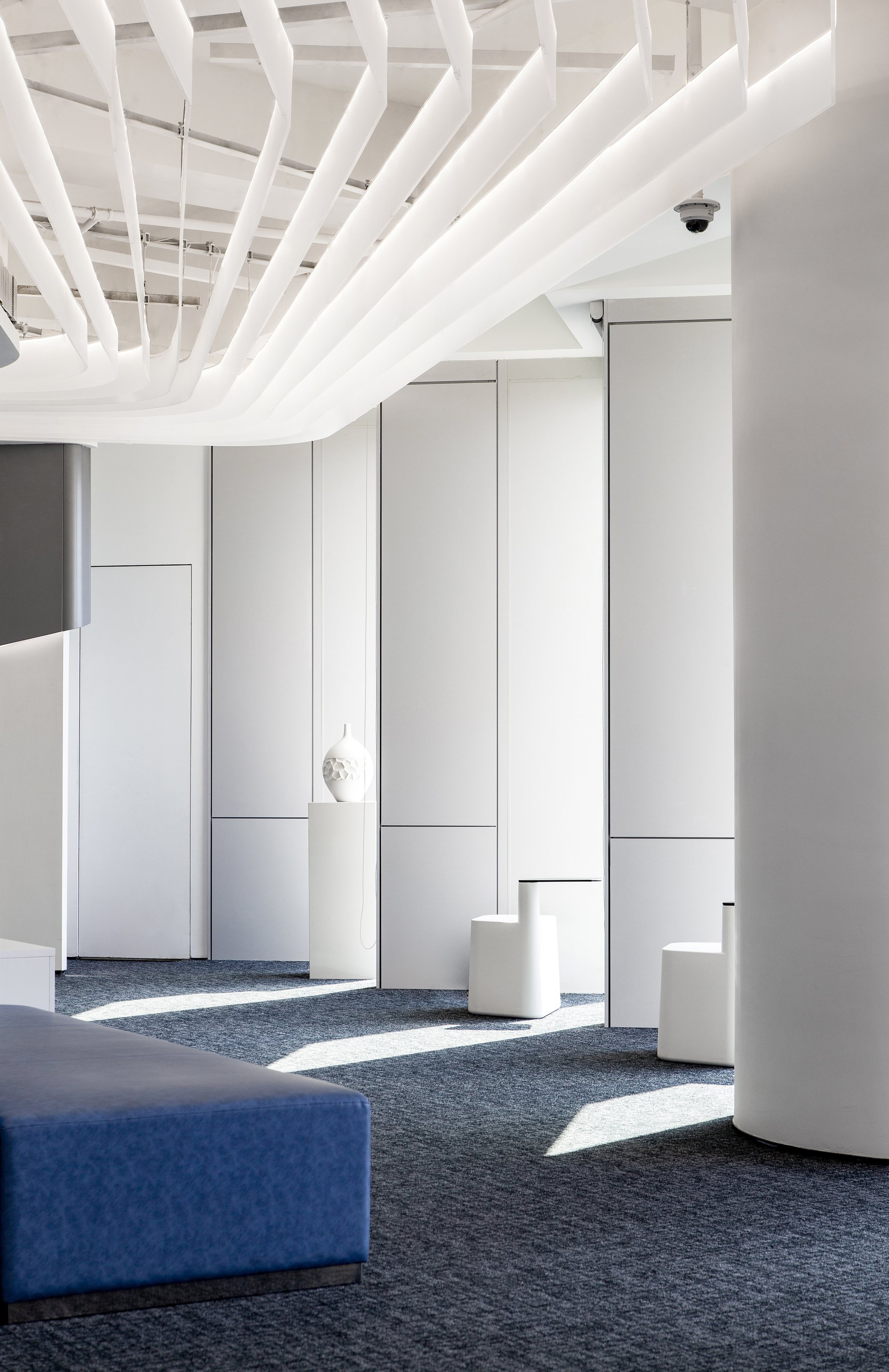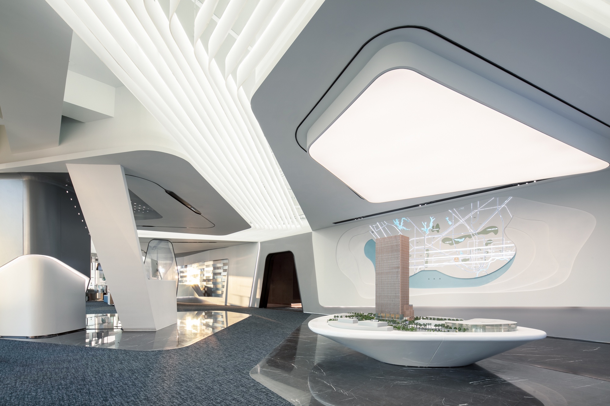 光是一種無形無聲的語言 品質(zhì)彰顯于燈光之下,光影帶動(dòng)感情升華 自然光線與筒燈、燈帶等廳內(nèi)光源相結(jié)合 在交織輝映中為空間譜寫光影旋律,展示廳內(nèi)的空間形體以圓弧與曲面為主 輕盈靈動(dòng)的線、面賦予固體更多表情變換 些許鮮麗的顏色點(diǎn)綴在素潔純凈的大廳內(nèi),煥發(fā)出宛如白瓷上釉般的流光溢彩。