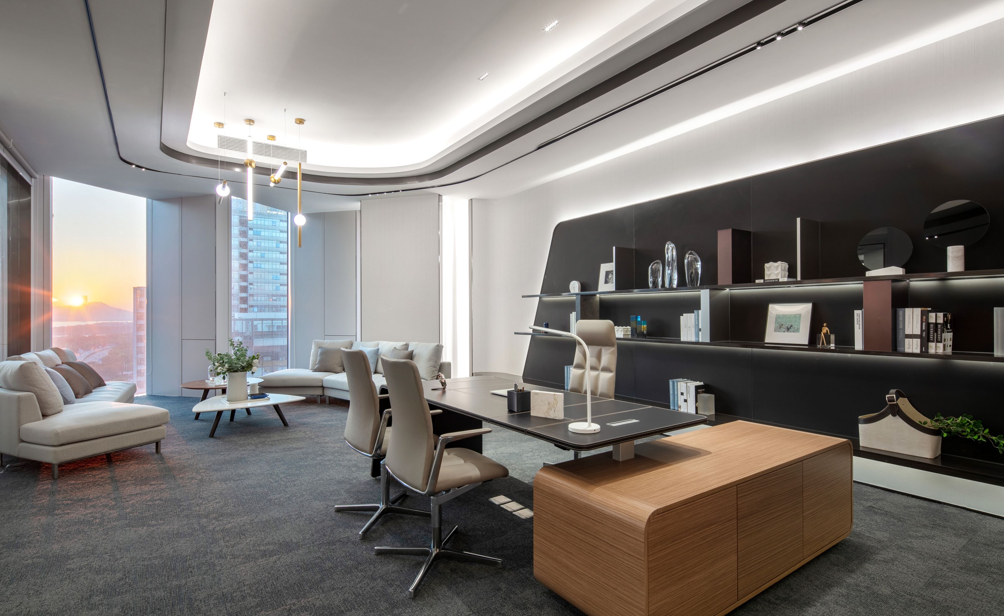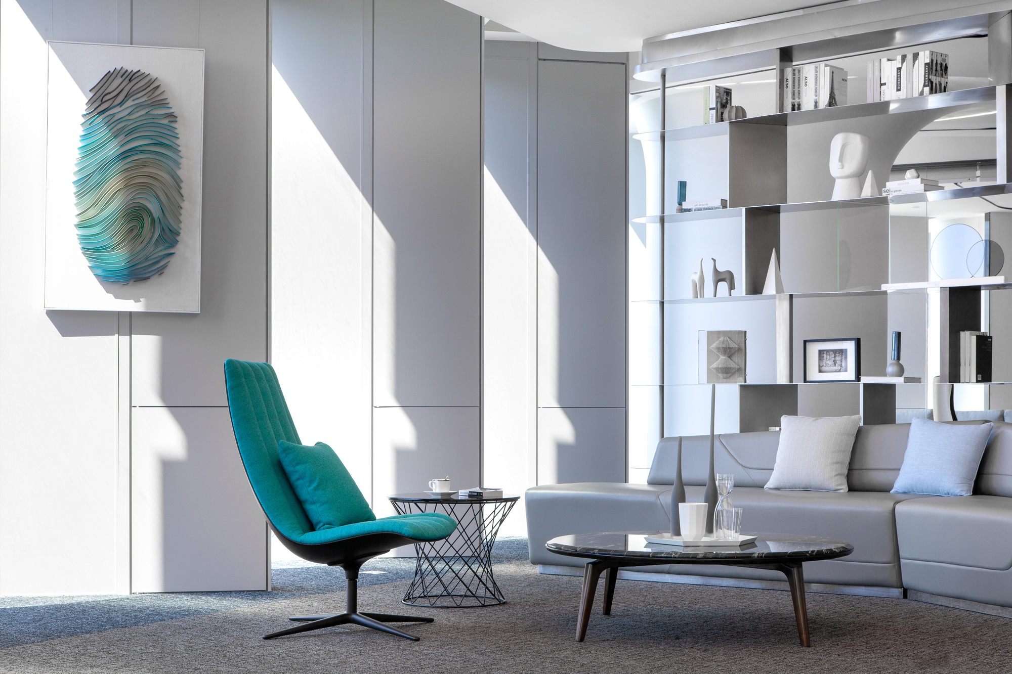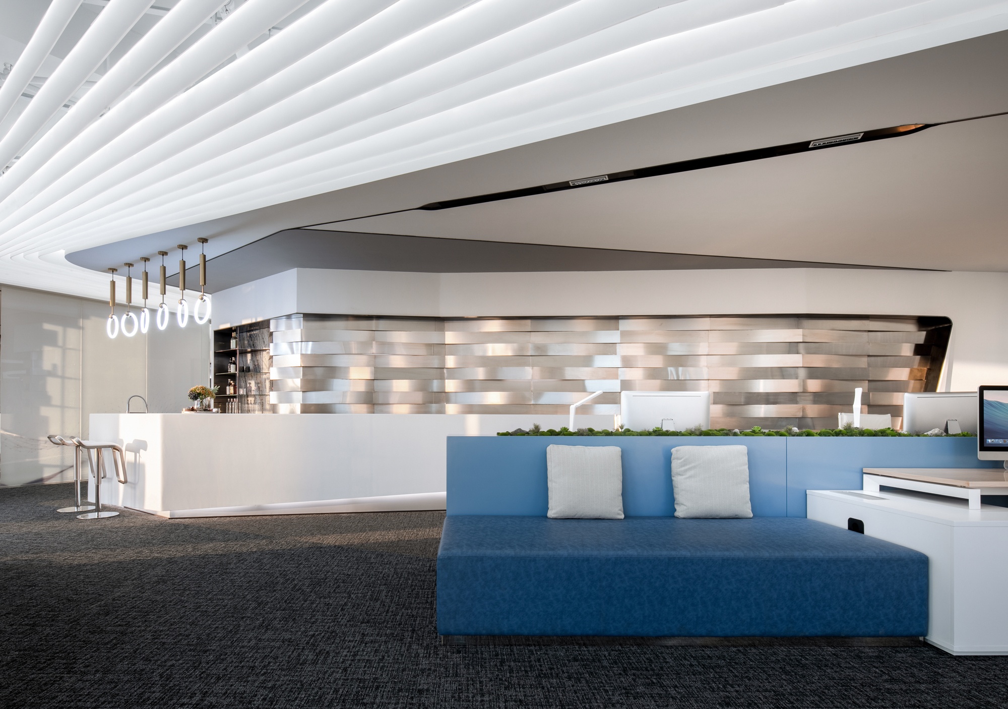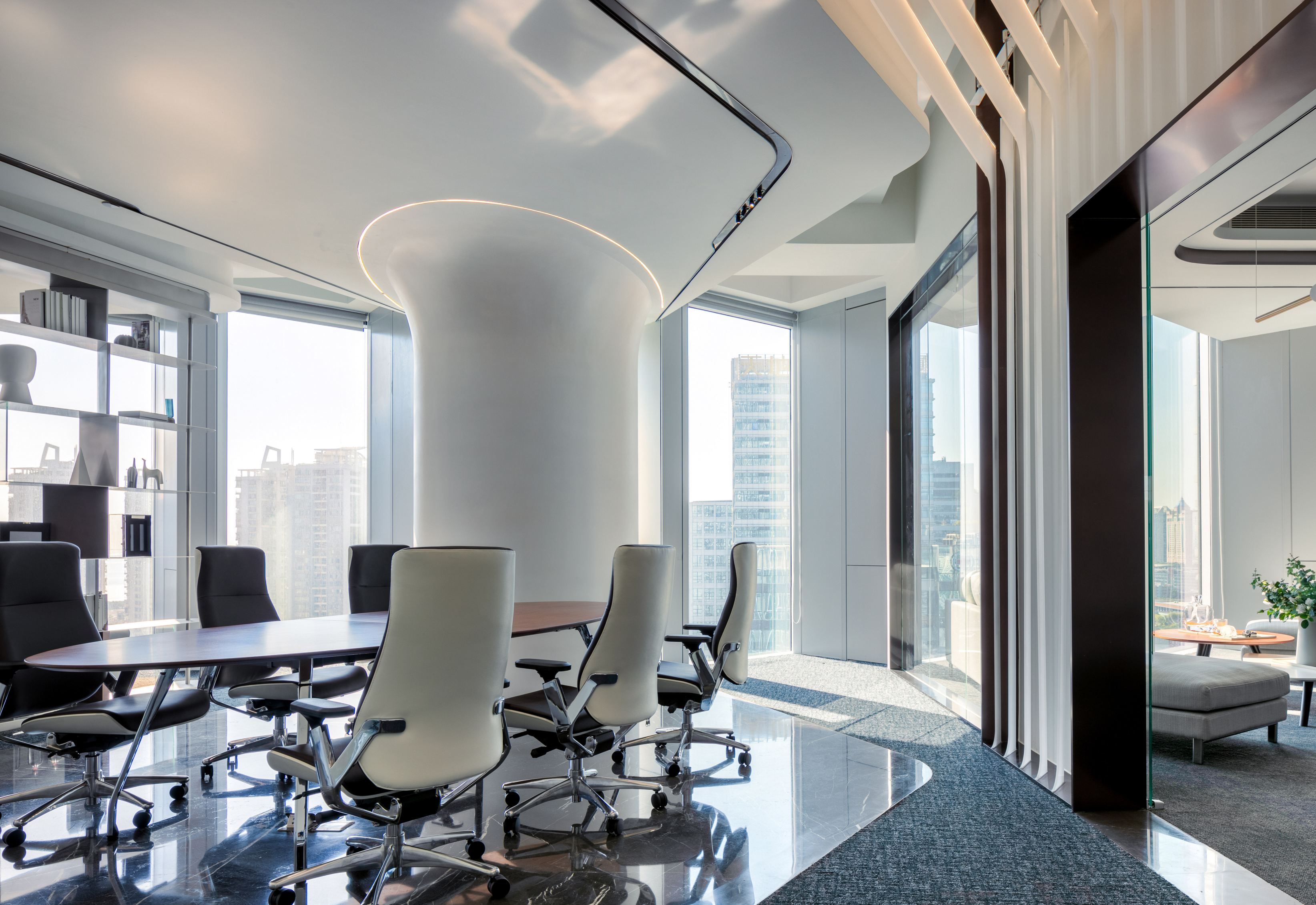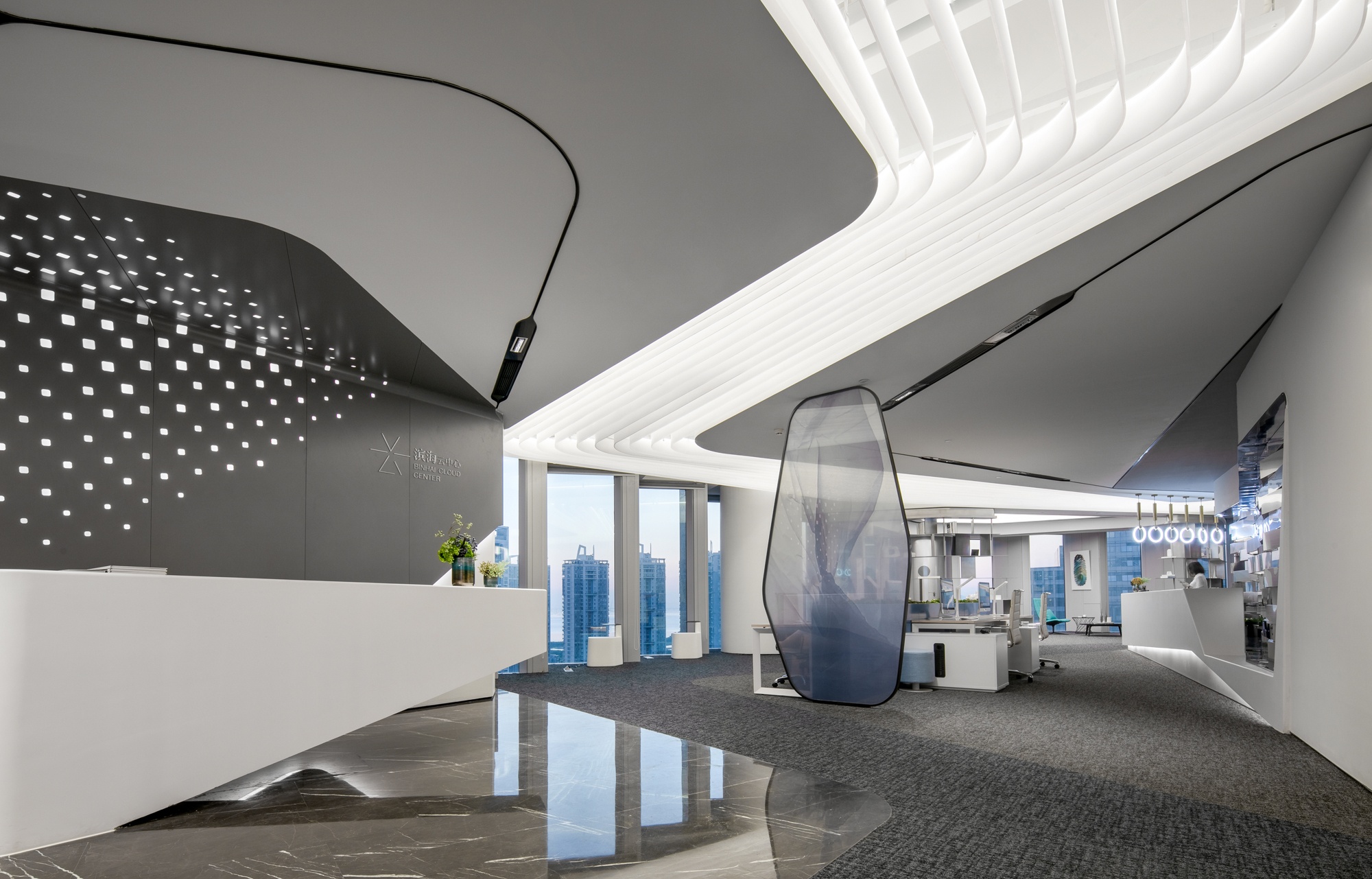 光是一種無形無聲的語言 品質(zhì)彰顯于燈光之下,光影帶動(dòng)感情升華 自然光線與筒燈、燈帶等廳內(nèi)光源相結(jié)合 在交織輝映中為空間譜寫光影旋律,展示廳內(nèi)的空間形體以圓弧與曲面為主 輕盈靈動(dòng)的線、面賦予固體更多表情變換 些許鮮麗的顏色點(diǎn)綴在素潔純凈的大廳內(nèi),煥發(fā)出宛如白瓷上釉般的流光溢彩。