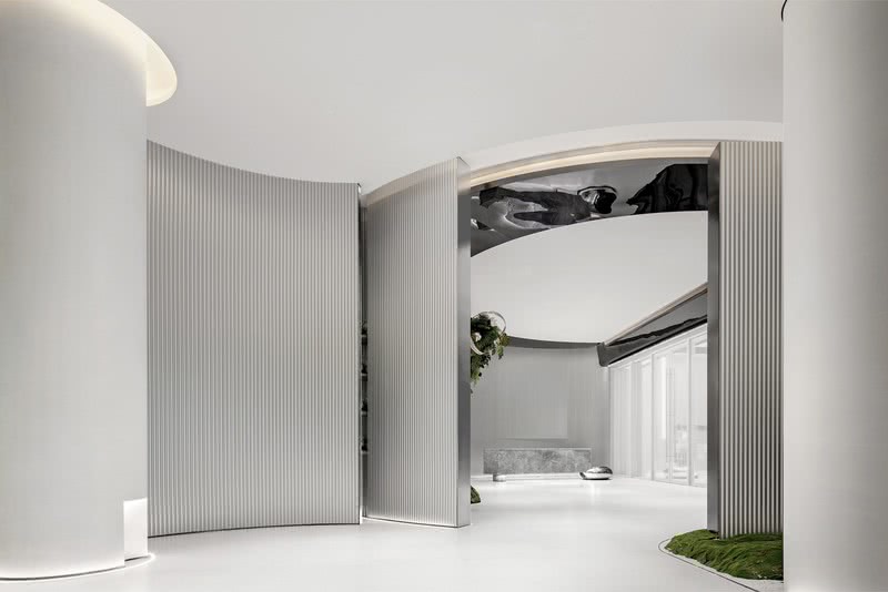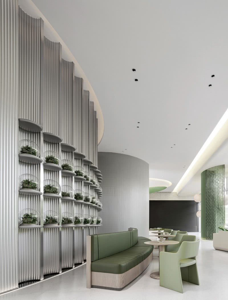 本次設(shè)計(jì)理念以樹洞象征著釋放、溝通及鏈接,是眾多童話故事或奇妙旅程的重要路引。以“樹洞”為空間的象征符號(hào),在有限的空間內(nèi)巧設(shè)門洞作為間隔,如迷宮般神秘吸引,令人衍生無限想象,不禁探索其中。穿梭行走在“綠光森林”里,人慢慢變小,本來在石頭上的一個(gè)個(gè)造型各異的弧形門洞變成了宮殿廊柱,墻上的金屬管狀燈成了疊加的光源,為人們照亮去往下一個(gè)空間的路。