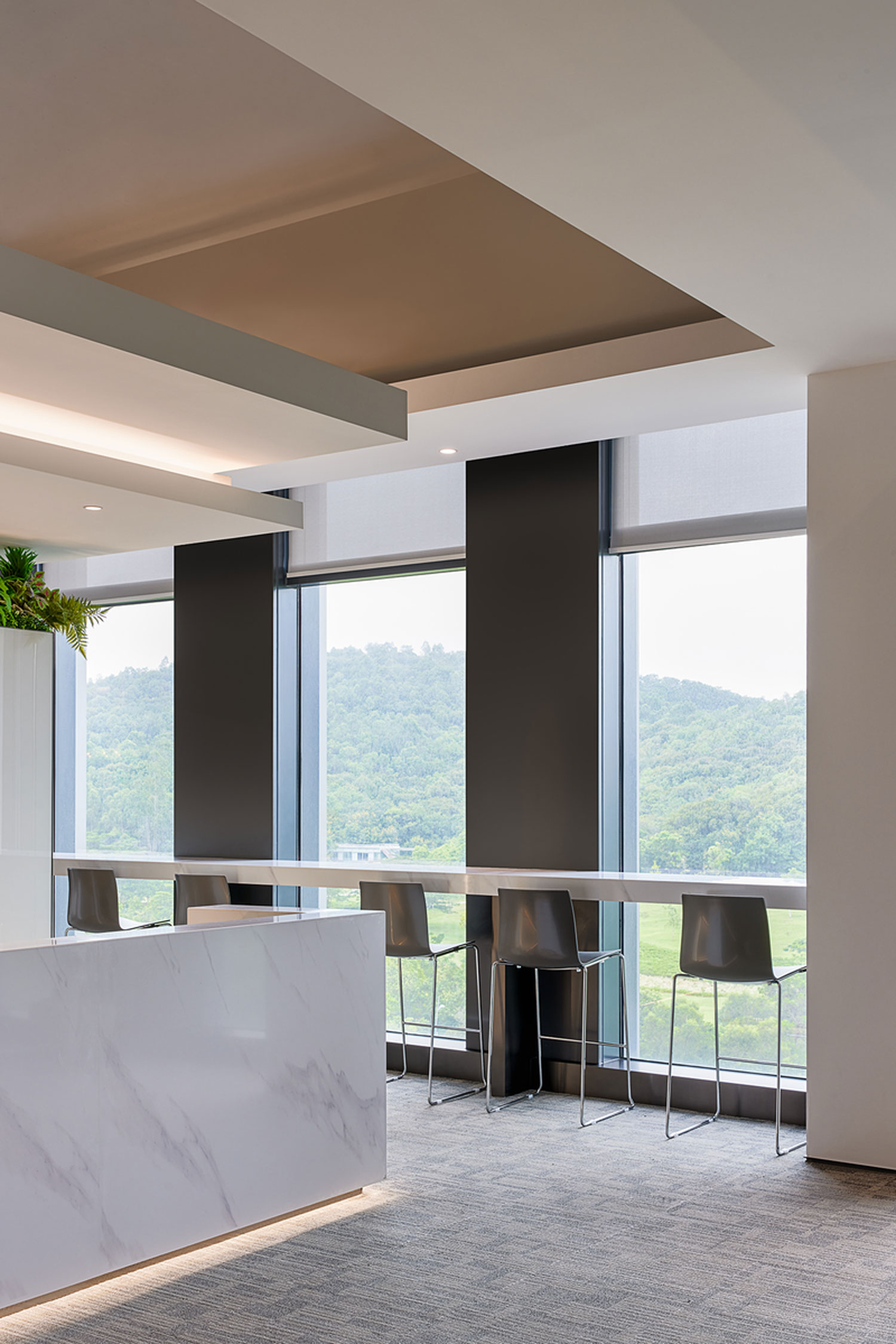入室,前臺造型層疊構(gòu)建,好似山丘的層巒疊嶂,植被景觀呼應(yīng)著造型,仿若從大自然延伸出的建筑,仿佛“流水別墅”般的異曲同工。 設(shè)計為辦公者打造了不同的辦公組合方式,不同空間及模塊相互掩映,虛實結(jié)合,而借景入室的手法,將景觀、自然、空間融為一體,借此調(diào)節(jié)辦公區(qū)域緊張的氛圍。 工位打破了工整排列的格局,成模塊化的不規(guī)則組合,緊扣靈活辦公的理念。動線上的自由感也為工作氛圍打造出輕松愉悅感。